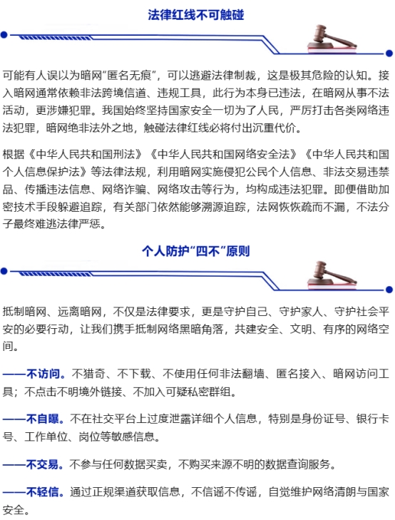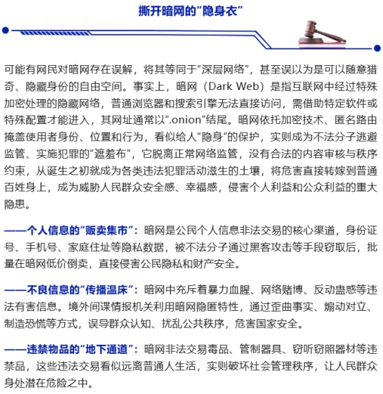 网络空间是亿万网民共同的精神家园,清朗安全的网络环境,直接关系每一位群众的切身利益。在我们日常使用的互联网之外,潜藏着一个不为普通人熟知的暗网,这个被称为“网络黑洞”的神秘地带,正被境外间谍情报机关及不法分子利用,成为滋生违法犯罪、侵害群众权益的重灾区。今天,让我们一起撕开暗网的“隐身衣”,认清危害,筑牢防线。