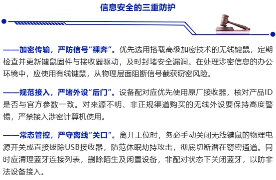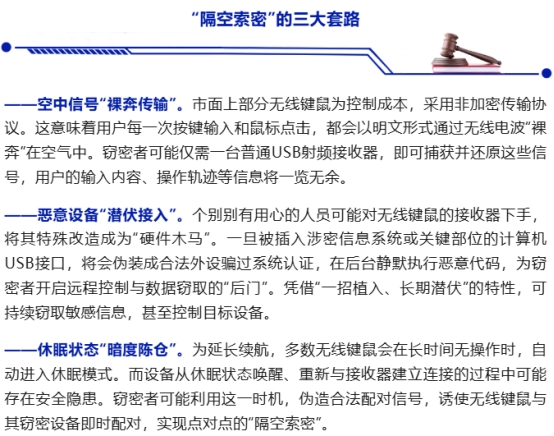 无线键盘、鼠标等设备以其简洁高效的体验,成为现代办公生活的标配。然而,这份便利的背后,若不加注意,也可能潜藏窃密风险。从空中信号截获到恶意设备潜伏,再到休眠重连漏洞,窃密者可通过多种手段实现“隔空取物”式窃密,对信息安全构成威胁。